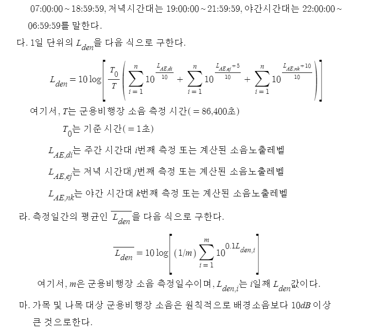 1. 배경소음도는 원칙적으로 군용비행장 소음이 발생하기 직전 또는 직후의 소음수준을 말하며 최소 5분 이상의 등가소음도로 한다.