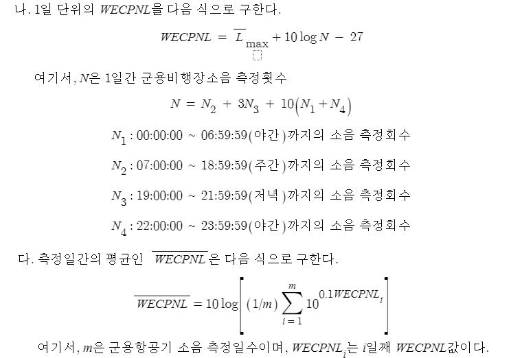 여기서, n은 1시간 단위 L95 소음통계레벨 산출횟수, Li는 매시간대 별로 측정된 L95 소음통계레벨 값이며, 군용비행장 또는 군사격장 소음이 1시간 동안 지속적으로 발생한 경우에는 그 값을 포함하지 아니한다.
