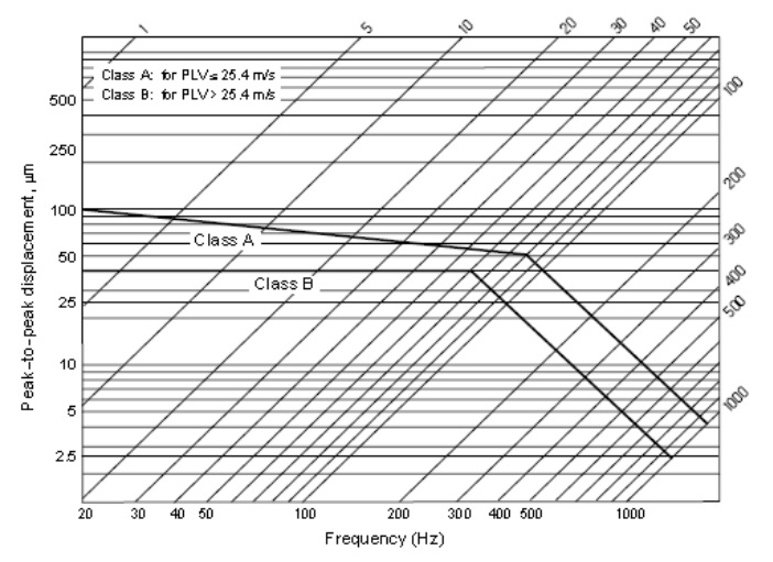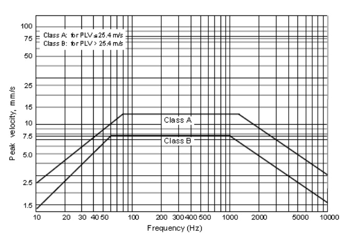본 규격은 Gear Unit의 Manufacturer의 Shop에서 Test 수행 시 적용하는 진동 기준치가 변위, 속도, 가속도 단위에 따라 각각 제시되어 있다. AGMA 규격의 경우, 진동 기준치 적용 시 주의할 점은 Unfiltered Vibration 값과 같은 단일 측정 값으로는 평가되어서는 안되며, 아래 그림에 명기된 바와 같이 진동 측정 주파수에 따라 각각 평가되어야 한다.