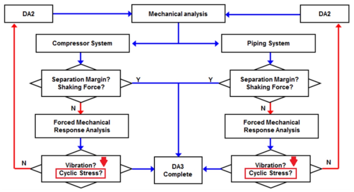 Cyclic Allowable Stress Criteria는 API 618 5th에 언급되어 있으며, 370 degC 이하의 온도와 Carbon Steel 재질이 적용된 배관의 경우, Peak to Peak Cyclic Stress 기준치를 180N/mm2으로 적용한다. 또한, 배관의 Elbow, Tee, Fittings, Flange, Welding Support 등의 적용에 의해 Stress Concentrate Factor(SCF=4)를 고려하여 Design Approach 3 단계에서 적용되는 최종 Peak to Peak Cyclic Stress Criteria는 45N/mm2로 고려하도록 한다. 한편, Stress Concentrate Factor 값은 개별 프로젝트 상황에 따라 상이하게 적용될 수 있다.